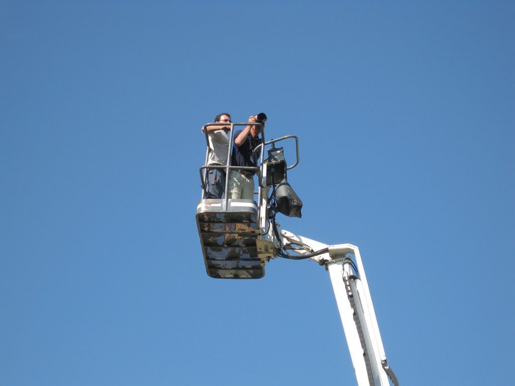 Was Christian als leidenschaftlichem Fotografen fehlt, ist eine Totalaufnahme des DBA-Treffens. Aber das scheint fast unmöglich. Fast – denn während einer Siesta im Schatten eines Baumes springt er wie von einer Tarantel gestochen auf. Er hat hoch über dem Baum einen Elektriker erblickt, der mittels einer hydraulischen Plattform Flutlichter für eine andere Veranstaltung montiert. Die Frage, ob er ihn mit hinauf nehme, beantwortet der Elektriker dahingehend, er sei «désolé», aber sein Patron würde das nie erlauben. Christian lässt nicht so schnell locker. Wo denn der Patron sei? Ja, der sei da unten. Ein freundliches Gespräch mit dem Patron und dieser hat plötzlich nichts mehr einzuwenden. Der Elektriker macht sich einen Spass daraus, die Plattform zur vollen Höhe auszufahren – wohl, um Christians Schwindelfreiheit zu testen. Oben meint er, der Patron werde wohl langsam alt, früher hätte der «Alte» das nämlich nie erlaubt.