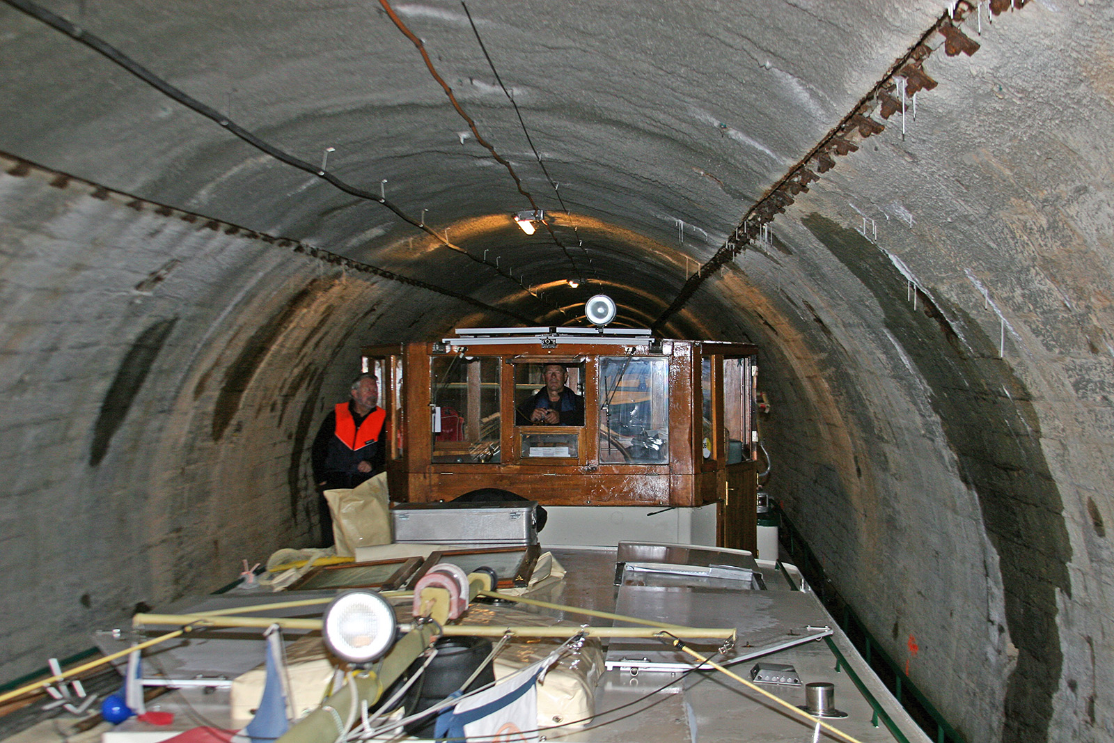 Das Problem ist weniger die zwar geringe Höhe als die Wölbung der Tunnelwand und das Fehlen eines Treidelpfads. Die Höhe des Tunnels ist mit 3.10 m am höchsten Punkt und 2.20 m an den Seiten angegeben. Wir haben die Gelegenheit, mit «Petra» durch den Tunnel zu fahren, und wir benützen diese Fahrt, um den Tunnel auszumessen. Resultat: Die Höhenangaben beruhen auf einem Wasserstand von 2.60 m im Tunnel, während die effektive Wassertiefe nur etwa 2.20 m beträgt.