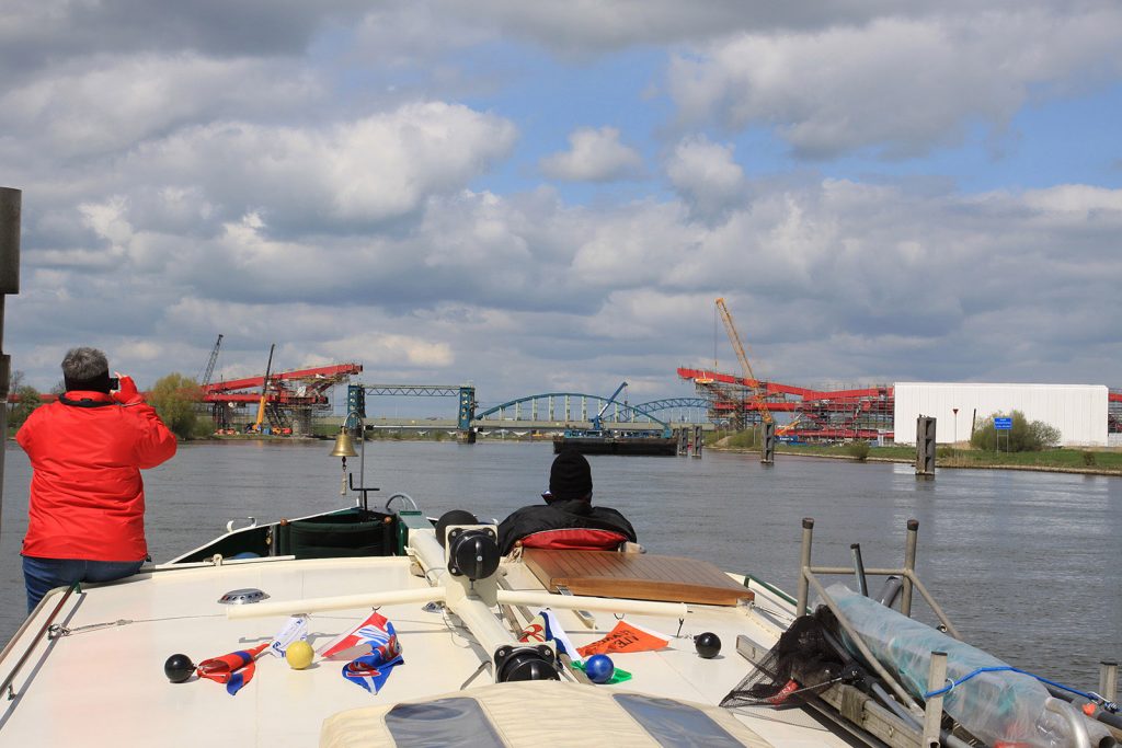 In einem dreitägigen Manöver wird das Mittelstück auf Pontons herangefahren und hochgehisst werden. Der Fluss wird dann für die Schifffahrt gesperrt sein. Wir haben Glück, die Operation «Mittelstück» wird erst in einigen Tagen beginnen.