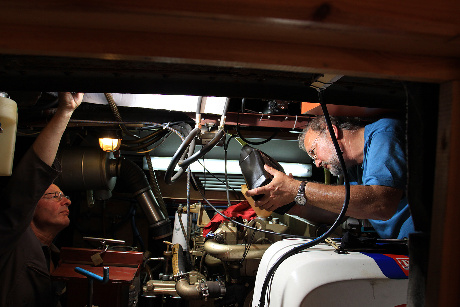 Aber ohne Fleiss kein Preis. Den letzten Ölwechsel haben wir vor 200 Betriebsstunden gemacht, Zeit also für frisches Öl. Nachdem Martin Eberhard gestanden hat, er sei unheilbar vom Schiffsvirus befallen, darf er mit Hand anlegen.