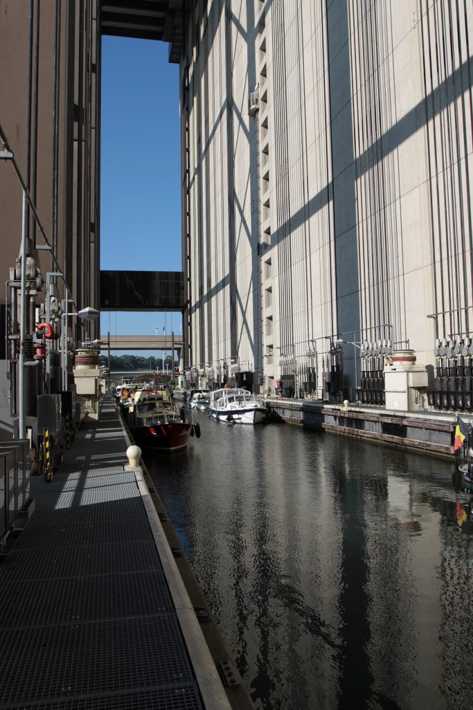 Weil wir im Unterwasser des modernen Schiffsliftes von Strépy-Thieu übernachtet haben, können wir am Morgen zeitig in die 112 Meter lange und 12 Meter breite Liftwanne einfahren, wo wir über 70 Meter gehoben werden.
